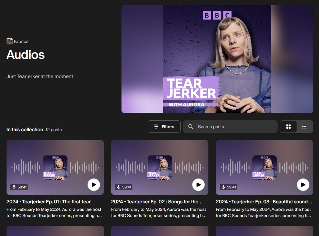 I also added all the audio episodes of Tearjerker (in HQ format, thanks to Marvel4), which is another way to listen to what I already did on Youtube (just Aurora’s talking parts, or a playlist re-creating the episodes as accurately as possible).